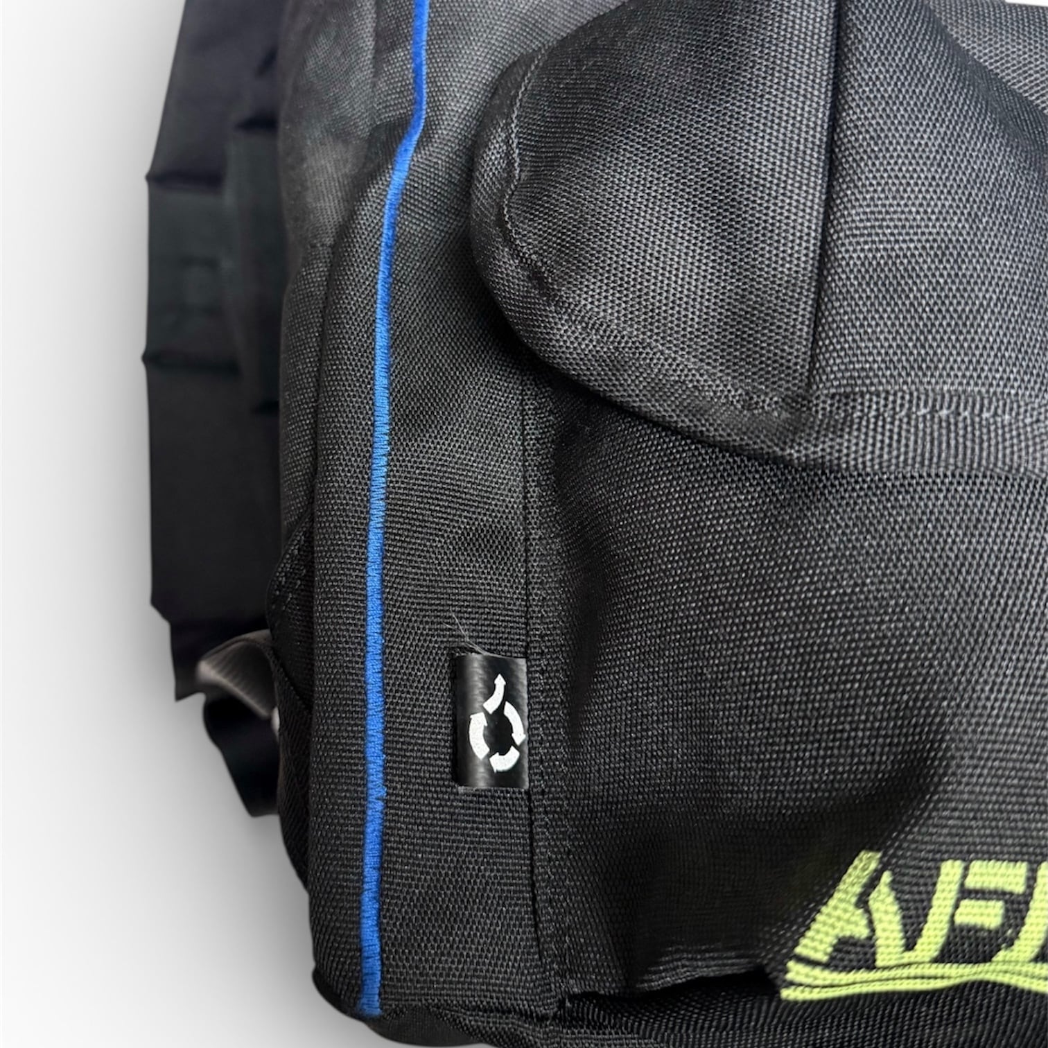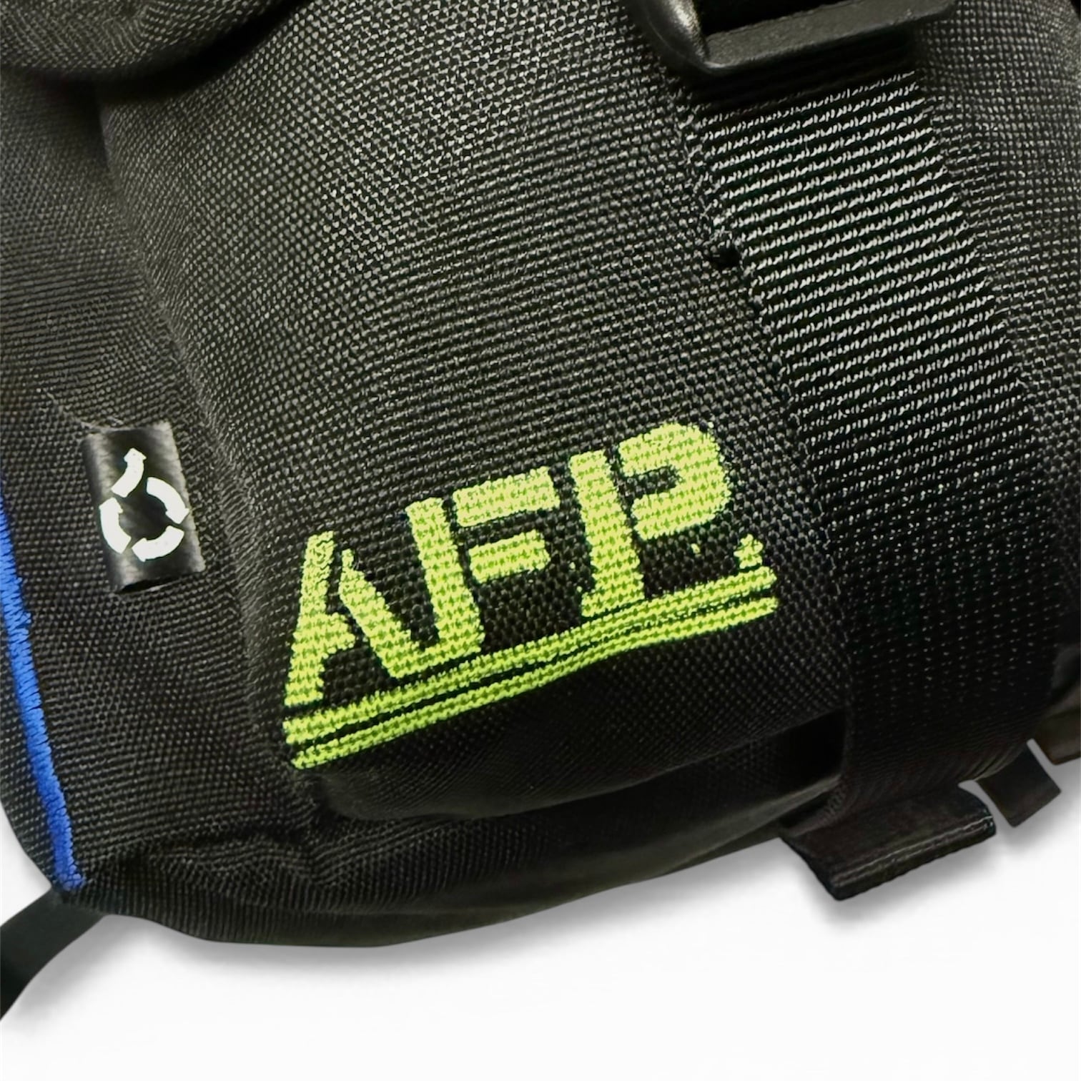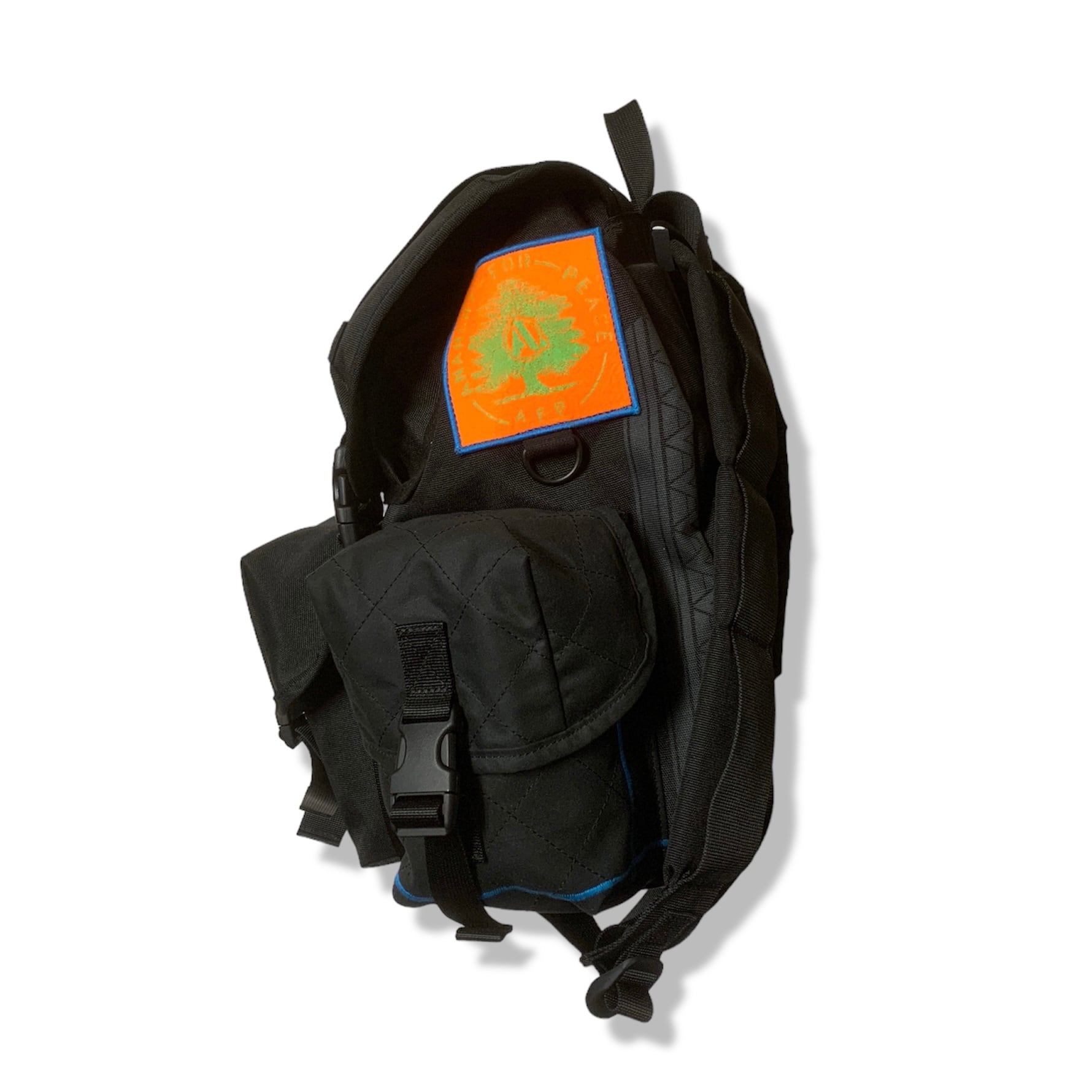 背中部分にはA.F.P.とA.C.T.のロゴと前ポケットにはA.F.P.のロゴが入り、さらにACTの作者がスケートボーダーと言う事もありショルダー部分に付くDカンはスケートボードの廃材から出来ています。大きい方のポケットには1リットルのペットボトルが入る程の大きさと、ポケットの数も多いので小物の仕分けがしやすい仕様になっています。